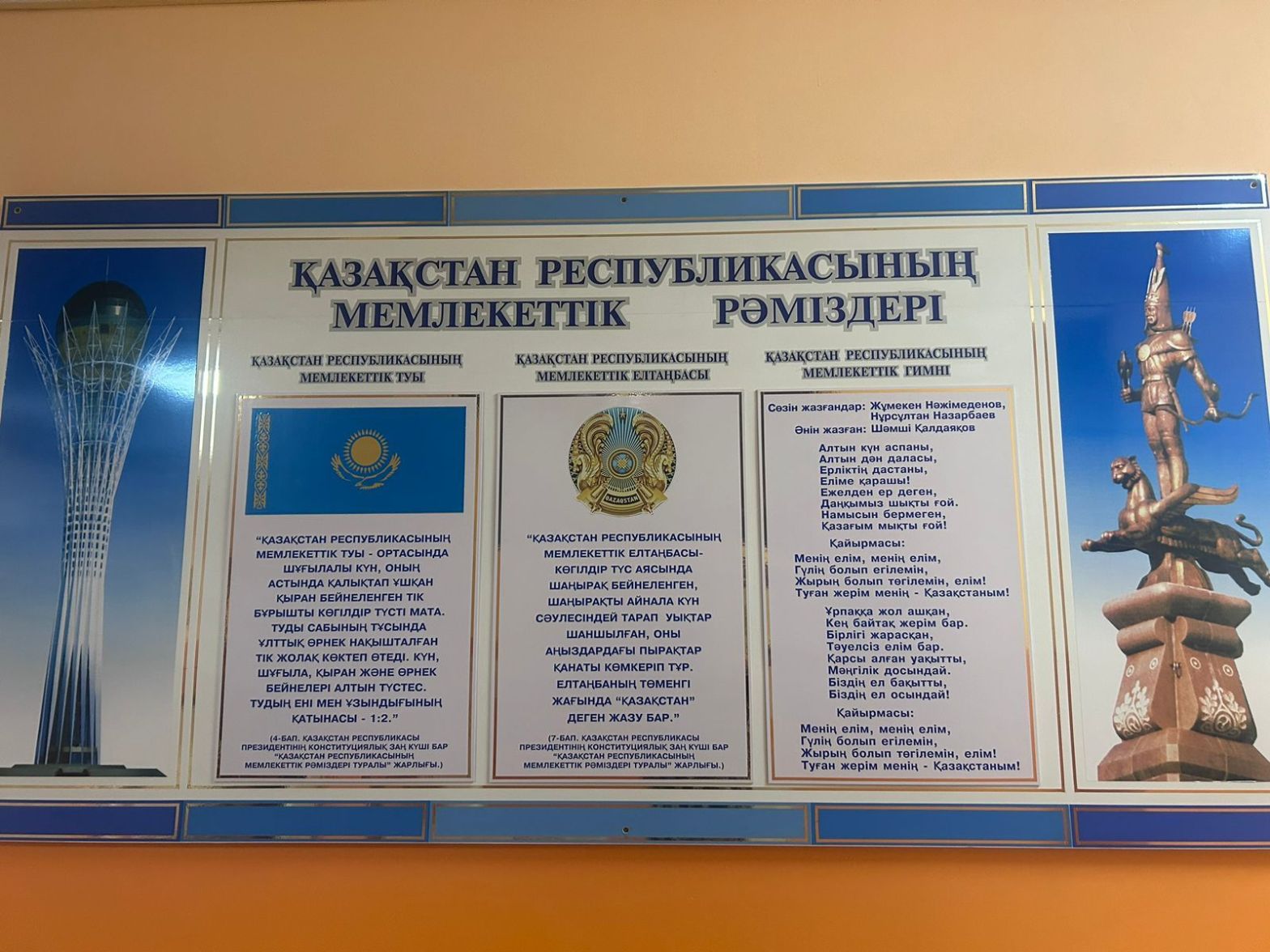 Государственный герб Республики Казахстан имеет форму круга и представляет собой изображение шанырака (верхняя сводчатая часть юрты) на голубом фоне, от которого во все стороны в виде солнечных лучей расходятся уыки (опоры). Справа и слева от шанырака расположены изображения мифических крылатых коней. В верхней части расположена объемная пятиконечная звезда, а в нижней части надпись «Қазақстан». Изображение звезды, шанырака, уыков, мифических коней, а также надписи «Қазақстан» — цвета золота.В основе Государственного герба Республики Казахстан лежит шанырак. Он стал сердцем герба.Это очаг, целостность мира, символ первоосновы государства семьи.Крылатый тулпар образ бессмертия, бесконечное развитие и духовное богатство народов, проживающих в Казахстане под одним шаныраком. Тулпар — символ сохранения строя суверенного Казахстана. Крылатый тулпар — это полет, мечта, молодое поколение, с которым всегда связаны надежды.Пятиконечная звездочка венчает герб. У каждого человека есть своя, путеводная звезда. Такая звезда должна быть и у государства.Авторами Государственного герба Республики Казахстан являются архитекторы Шота Уалиханов и Жандарбек Малибеков.